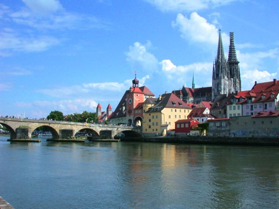 Regensburg an der Donau war eine anders Stadt aus der Römerzeit. Hinter der Brücke ist die älteste Wurstbude Deutschlands.